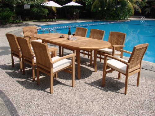 New 9 Pc Luxurious Grade-A Teak Dining Set - 94" Oval Table And 8 Stacking Arm Chairs [Model:WV5] Product Description: