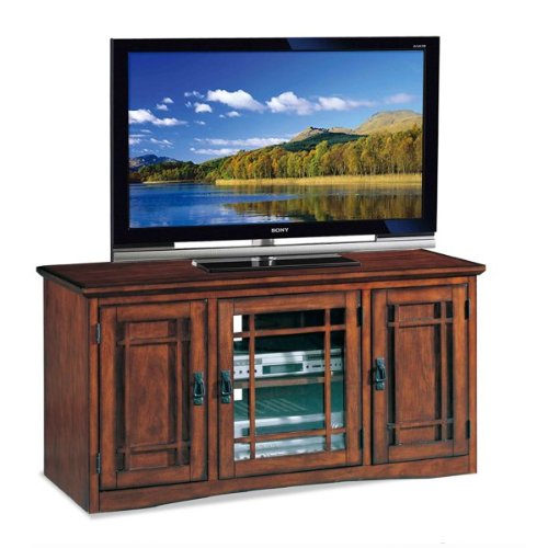 82350 This 50'' wide by 25'' high mission style console features a hand rubbed mission finish over solid wood and wood veneers. Features multiple component storage and large cord access slots management slots in back panel for extra cooling. Mission Style Console Features: -Hand Rubbed Mission finish. -Solid wood and wood veneers construction. -Decorative wood door with beveled tempered glass. -Multiple component storage behind door and large cord access slots management. -Slots in back panel for extra cooling. -Two media storage cabinets on each end with one adjustable and one fixed. -Black metal mission style hardware. -Easy to assemble hinge method construction. -Assembly required.